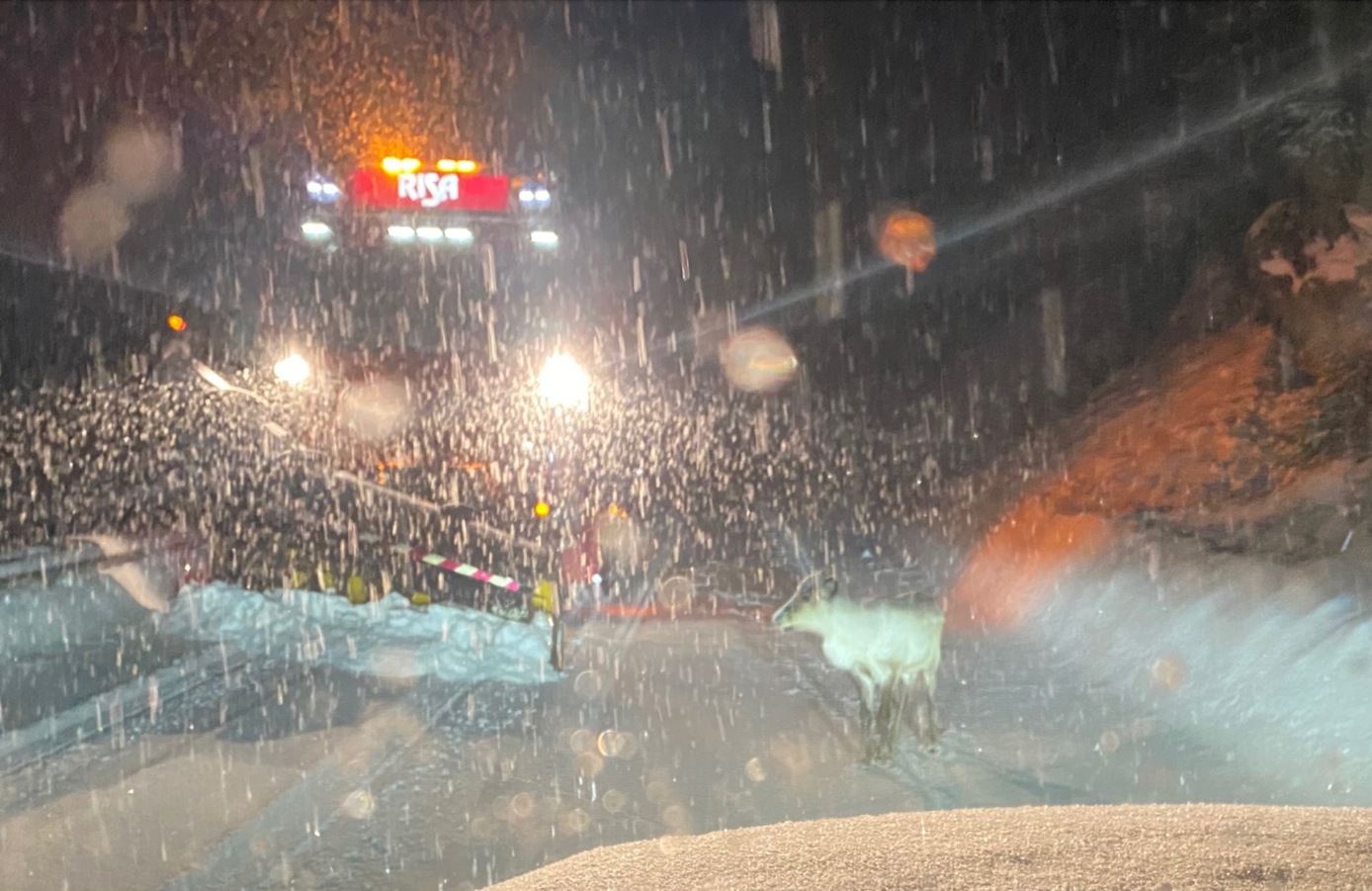En reinkalv hadde forvillet seg til Dorgabakken torsdag. Dette bilde er tatt klokka 2120 torsdag kveld.
