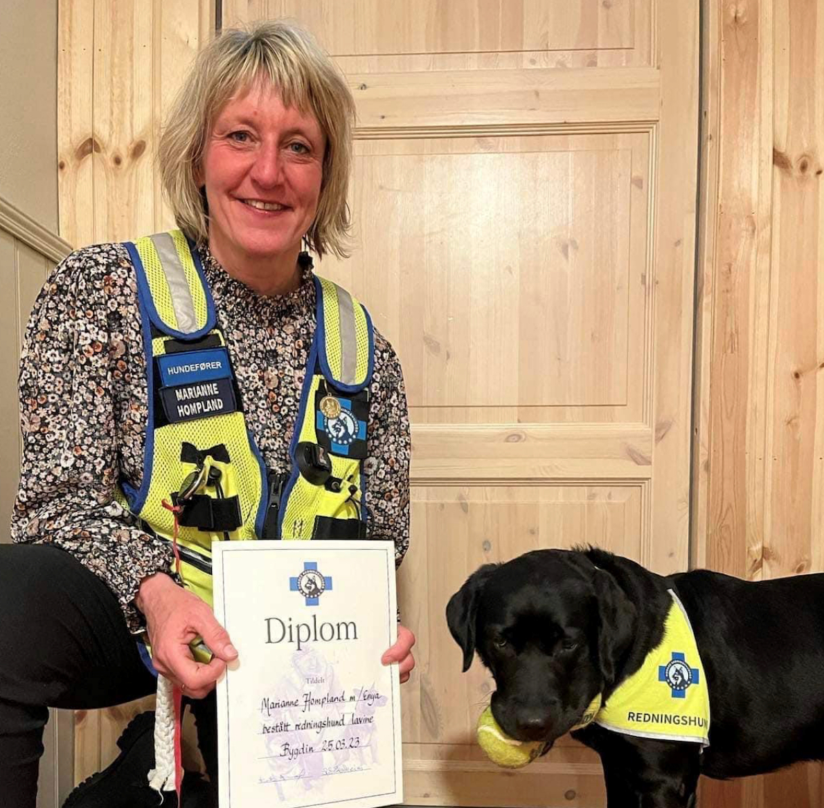 Marianne Hompland fra Tonstad fikk i forrige uke godkjent hovedkurs for sin lavinehund, Enya. Nå er hun klar for frivillig innsats 24/7. Marianne og Enya er klar til søk etter savnede i snø og snøskred og redning når alarmen eventuelt går.